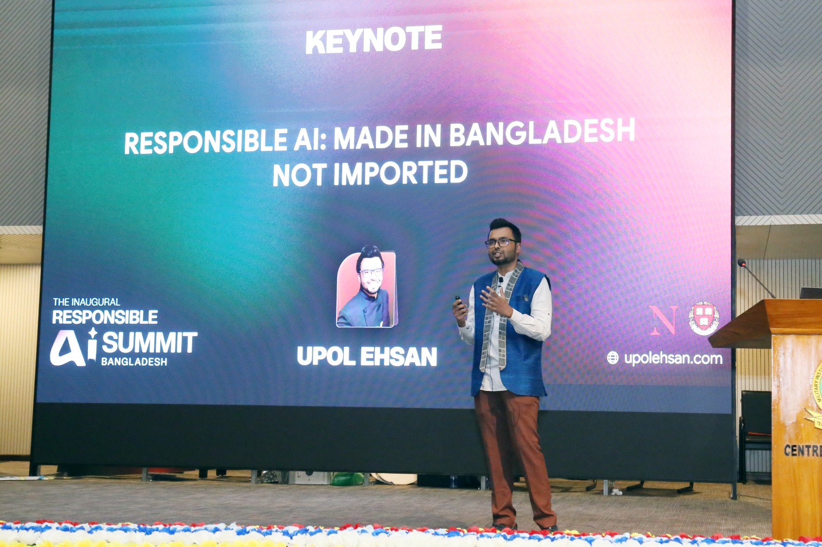 The keynote address was delivered by Dr. Upol Ehsan, Assistant Professor at Northeastern University and Berkman Klein Fellow at Harvard University. In his keynote speech titled “Made Here, Not Imported: Responsible AI in Bangladesh,” he emphasized the importance of developing locally relevant and context-aware AI solutions, which deeply inspired the audience.