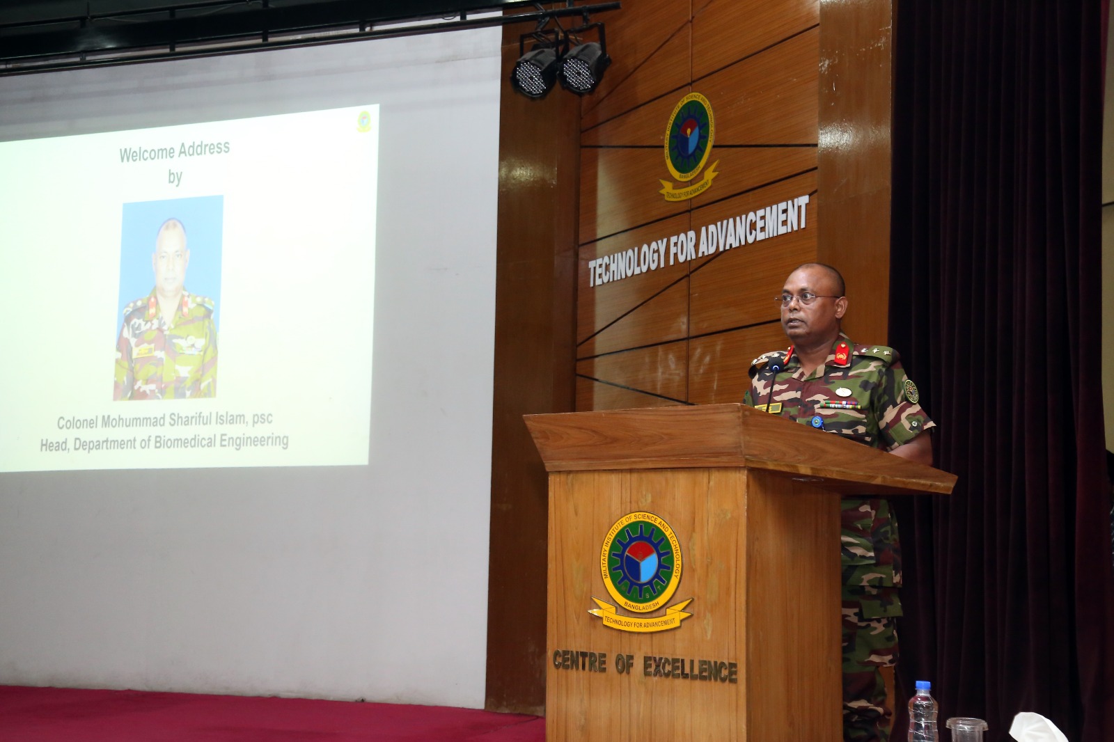 The respected Commandant of MIST, Maj Gen Md Nasim Parvez, BSP, ndc, afwc, psc, graced the occasion as Chief Guest. The session was inaugurated with a welcoming speech delivered by Col Mohammad Shariful Islam, psc, Head, Department of BME. The distinguished guest speaker, Prof Dr. Md. Sharif Hossain, Department of Biotechnology and Genetic Engineering, Jahangirnagar University, presented his pioneering research on the applications of nanotechnology in clinical practice and its transformative role in healthcare. The session was highly engaging and followed by an interactive question-and-answer segment.